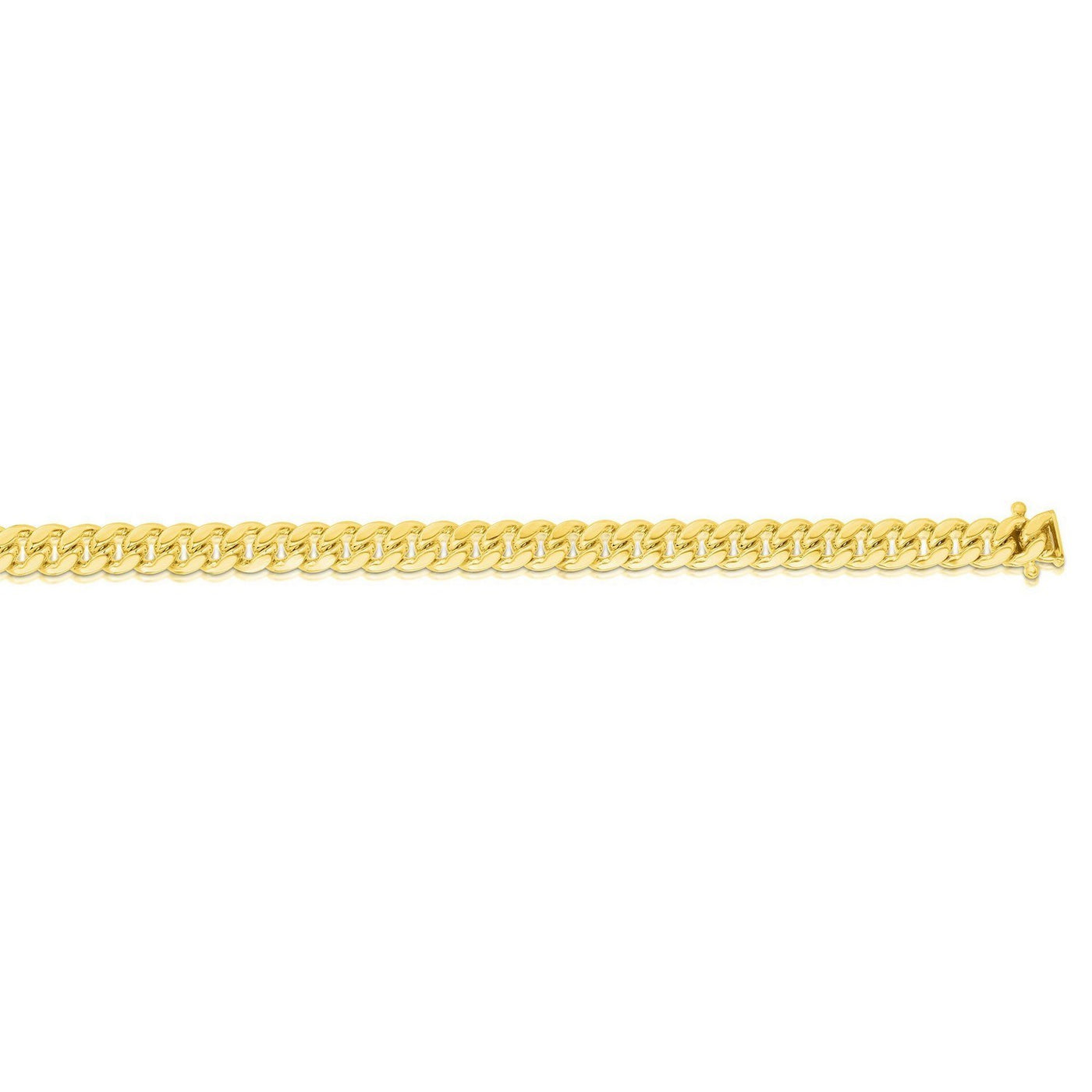 This Classic Miami Cuban solid bracelet comes in 14k yellow gold and has a width of 5.0 millimeters. Secured with a box clasp.