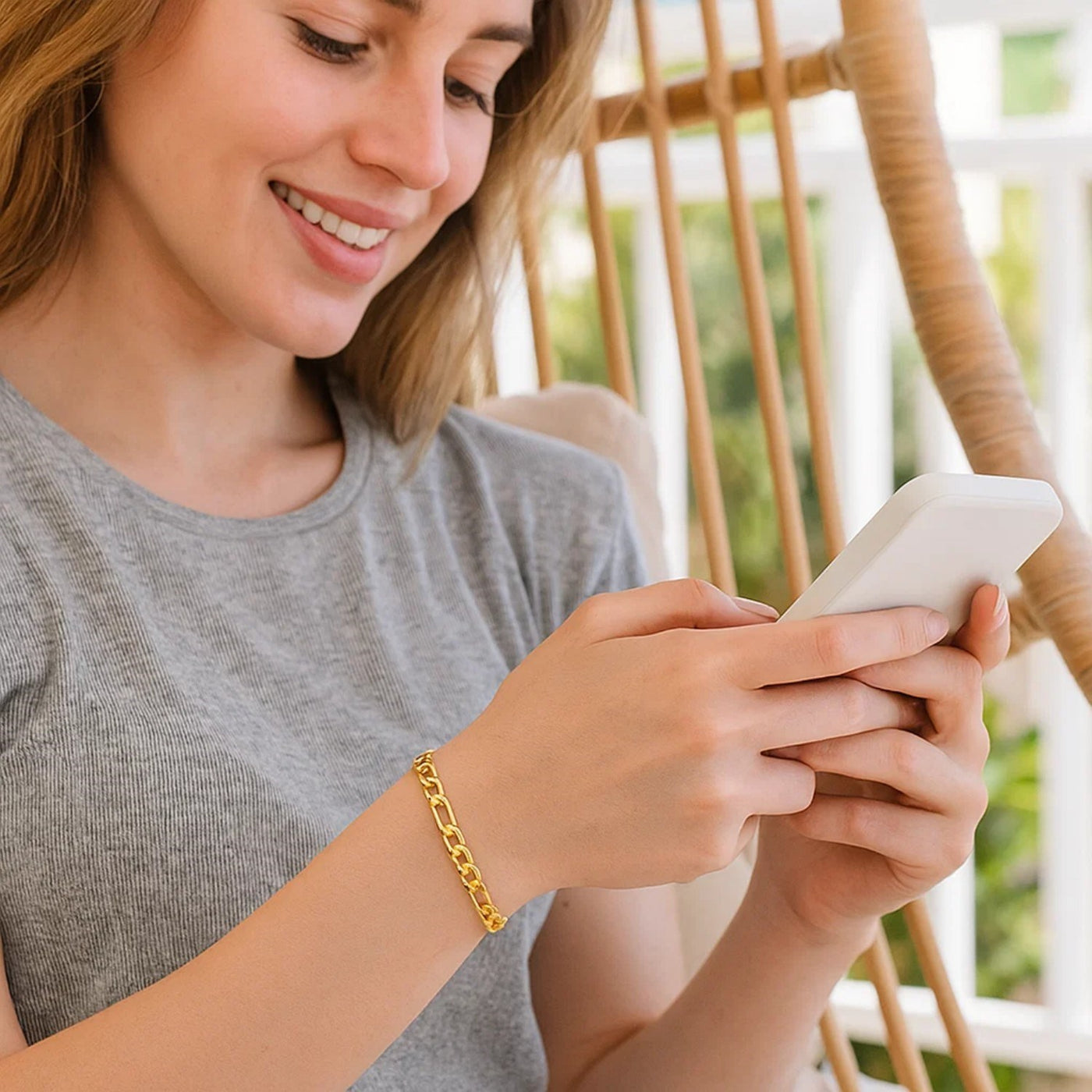 This Lite Figaro bracelet comes in 14k yellow gold and has a width of 4.6 millimeters. Secured with a lobster clasp.