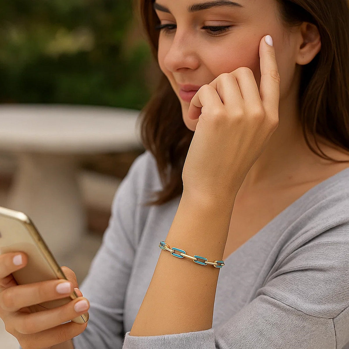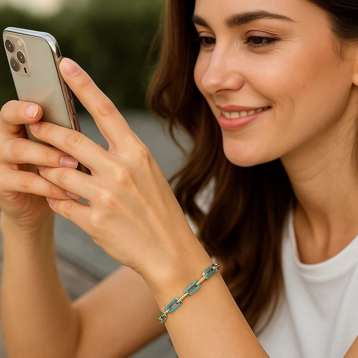 An exquisite 14k yellow gold paperclip gem link bracelet, highlighting a blend of gold and turquoise links in a contemporary...