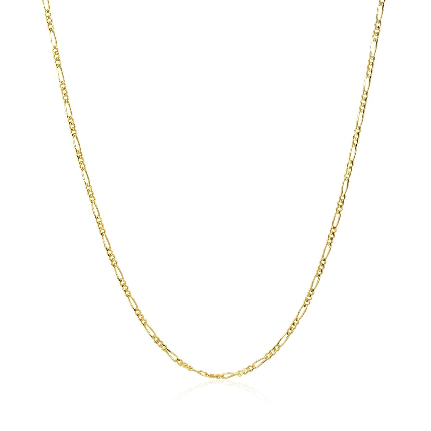 This solid Figaro chain comes in 14k yellow gold and has a width of 1.30 millimeters.