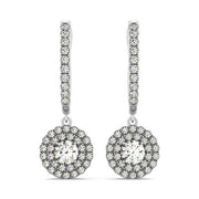 A gorgeous pair of drop diamond earrings featuring a classic double round halo design. These beauties are made of 14k white gold and secured with hinged backs.