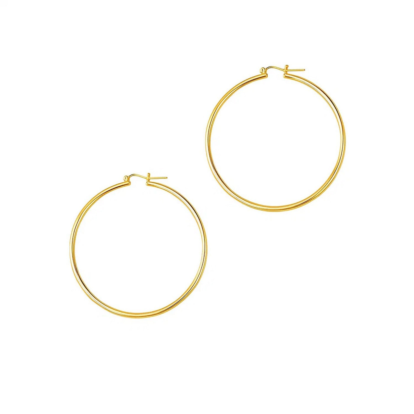 These timeless hoop earrings crafted in 14k yellow gold and measure 45 millimeters in diameter, featuring a snap lock backing.