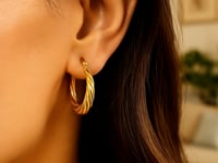 A delightfully artful display of elegance in the form of textured hoop earrings. Designed in fine 14k yellow gold and showcasing a lovely graduated and twisted look. These earrings come with snap lock style backings.
