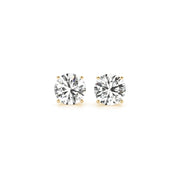 Four prong 14k yellow gold stud earrings feature two perfectly matched IGI certified lab grown round cut diamonds with a total weight of 2 carat. Secured with push backs.