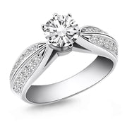 Two rows of glittering pave diamonds enliven the band of this substantial cathedral engagement ring. The ring shank tapers toward the center setting and features a polished border in between the two rows of pave. Expertly crafted in 14k white gold, the center highlights a sparkling 1/2 carat round cut diamond.
