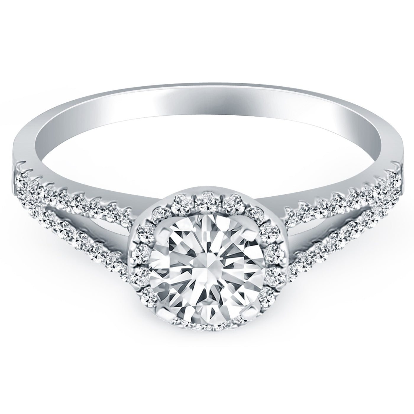 This beautiful diamond halo split shank ring has a sparkling surprise in store for you. Accent diamonds on the side highlight an intricate lattice beneath the center diamond. Pave diamonds light up the band while the attractive bright finish adds charm. The center highlights a sparkling 1/2 carat round cut diamond.