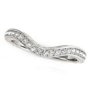 A showcasing milgrained detailing and antique-inspired elements, this curved wedding band are utterly gorgeous. Made of 14k white gold and set with round diamonds.