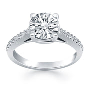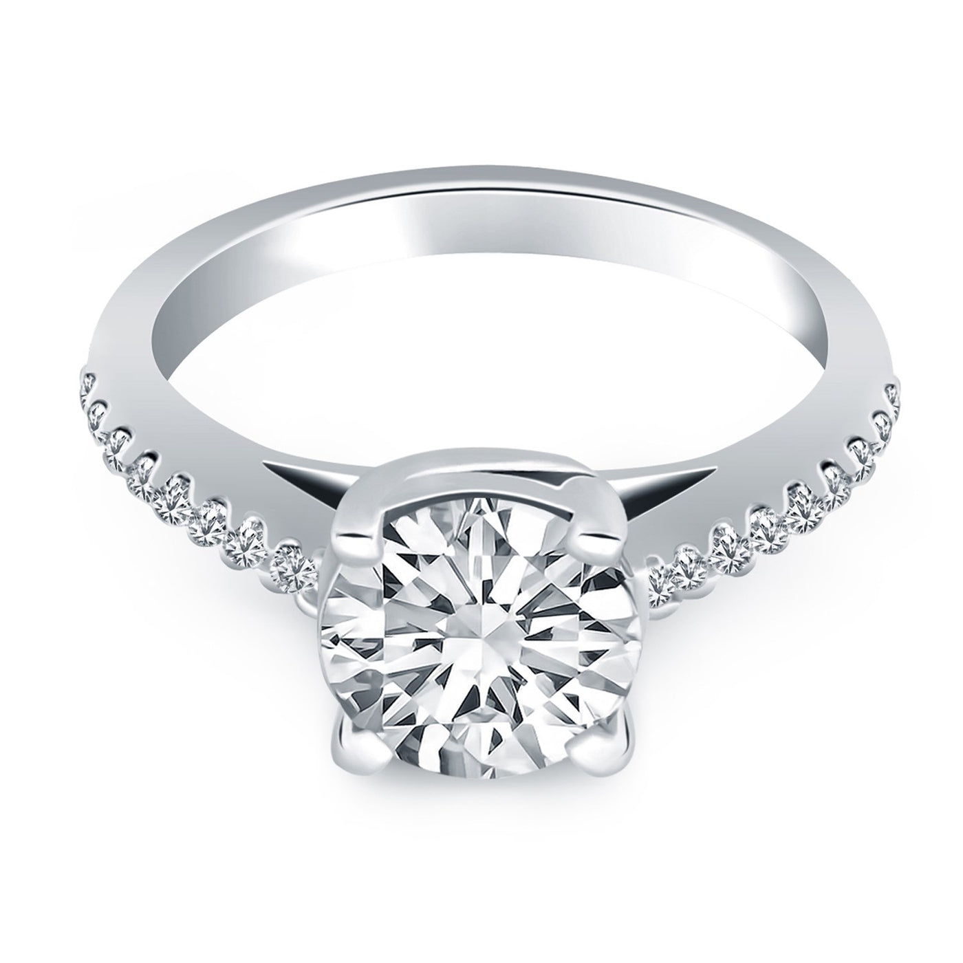 The gentle sweeping curves of the prongs in our trellis engagement ring bring a graceful elegance to the classic silhouette. Expertly crafted in 14k white gold, this ring is encrusted with diamonds along the shank and showcases a sparkling 1/2 carat, round cut center diamond.