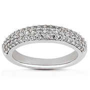 Encrusted with brilliant diamonds, this is a wedding band certain to be noticed. The ring is expertly crafted in gleaming 14k white gold and features three rows of pave diamonds sparkling in their settings. The diamonds extend halfway across the front of the band. The look is glamorous and bold.