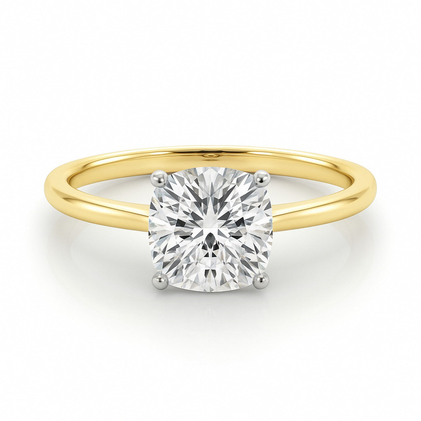 Celebrate life’s most meaningful moments with this breathtaking 2 carat cushion-cut lab-grown diamond solitaire ring a flawless fusion of timeless elegance and contemporary style. IGI certified with G color and VS1 clarity, the diamond sparkles with exceptional brilliance and outstanding quality you can trust. Set in a classic four-prong 14K white gold head and complemented by a polished 14K yellow gold band, the sophisticated two-tone design creates a stunning contrast that’s both traditional and modern. Whether it’s for a proposal, anniversary, or a once-in-a-lifetime milestone, this masterfully crafted ring is designed to be cherished forever.