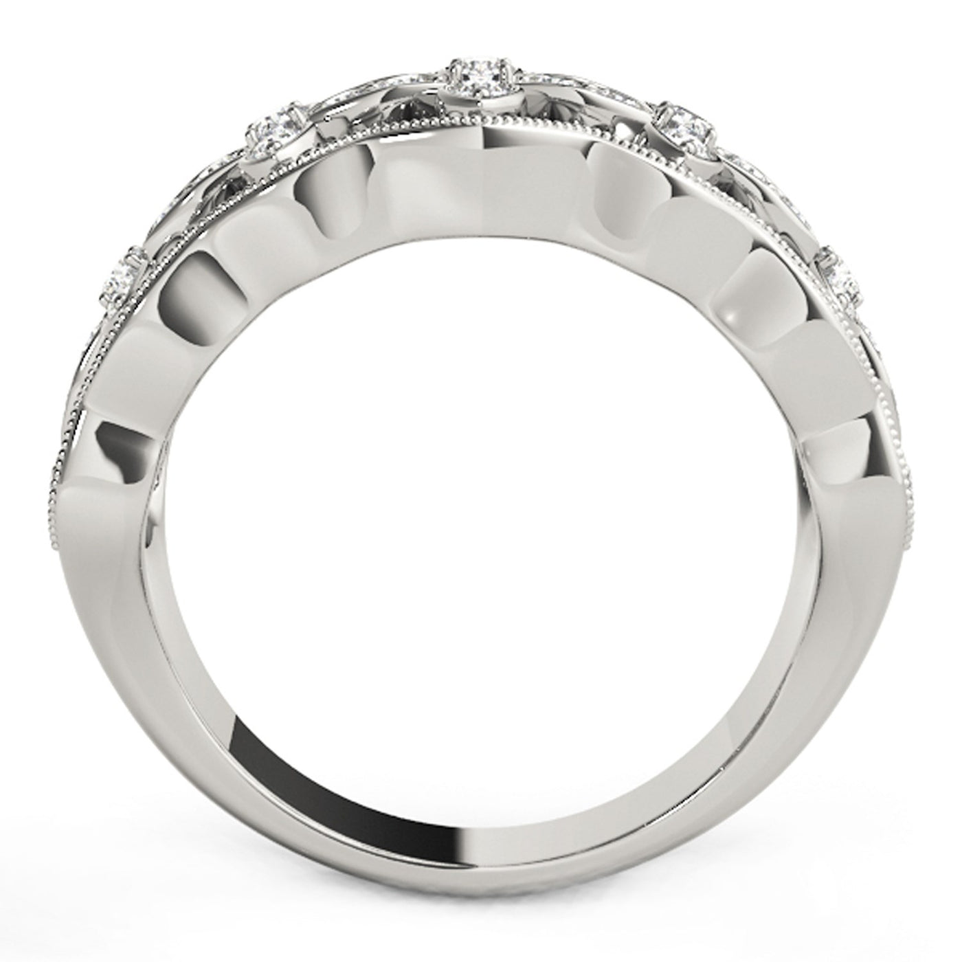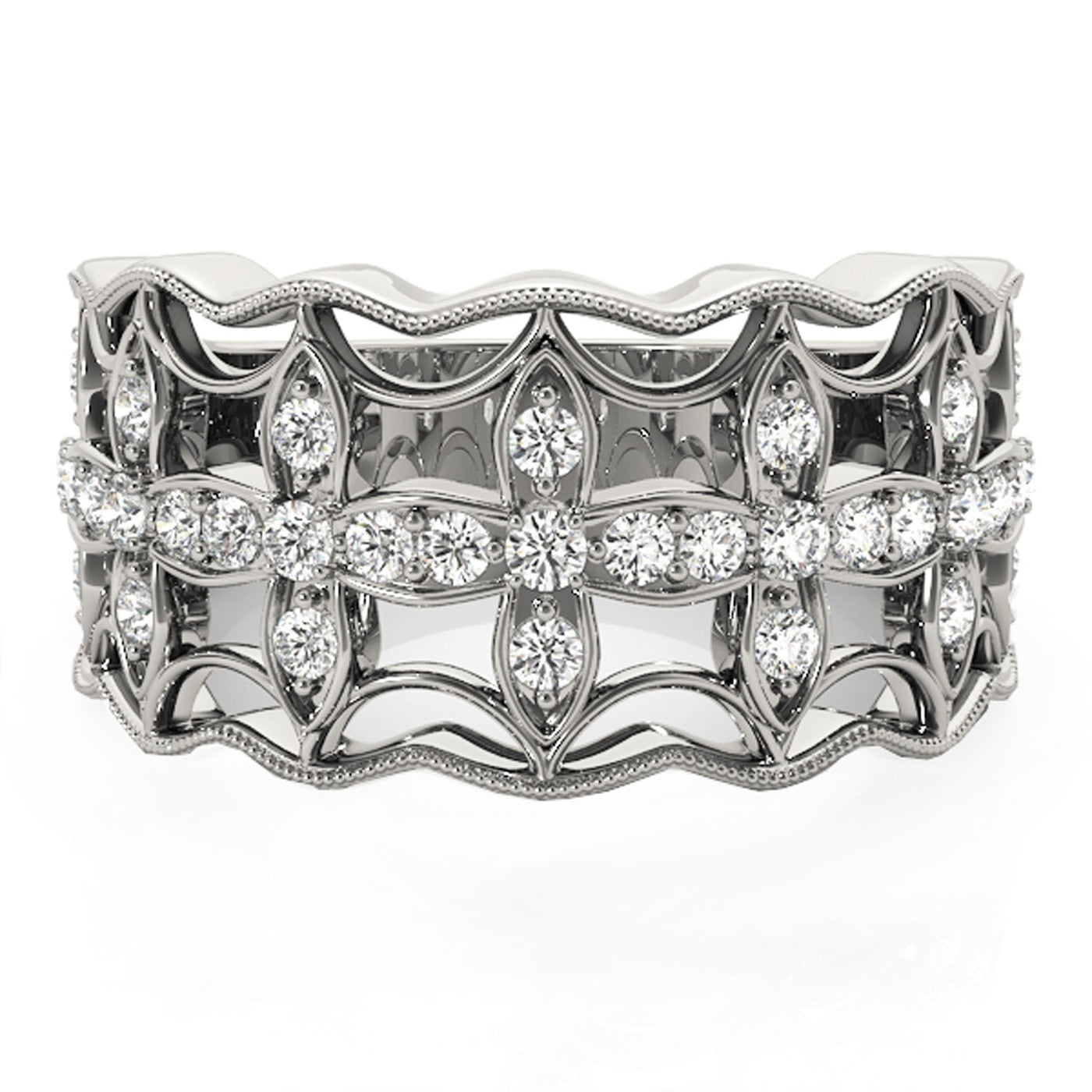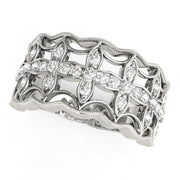 This unique ring features waves of shine surrounding four-leaf clover shapes with diamonds in 14k white gold.Product Details: Ring Information...