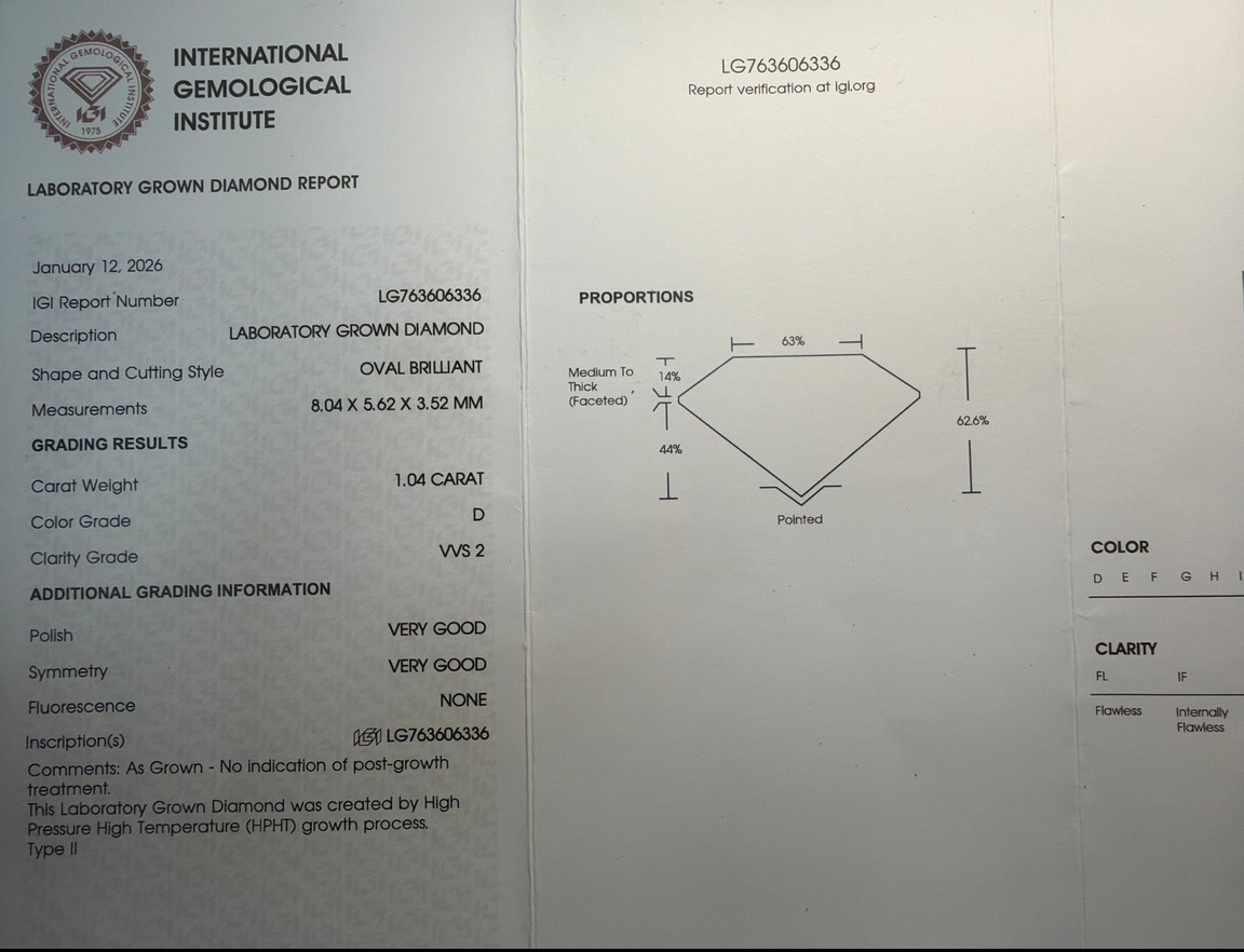 Tijdperk: Na 2000Staat: NieuwGeslacht: Dames Diamant: Type: Lab-grown diamantVorm: OvaalSlijpvorm: Briljant geslepenKaraatgewicht: 1,04 ctKleur: D (kleurloos)Zuiverheid: VVS2Aantal stenen: 1 Metaal:...