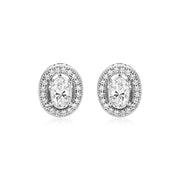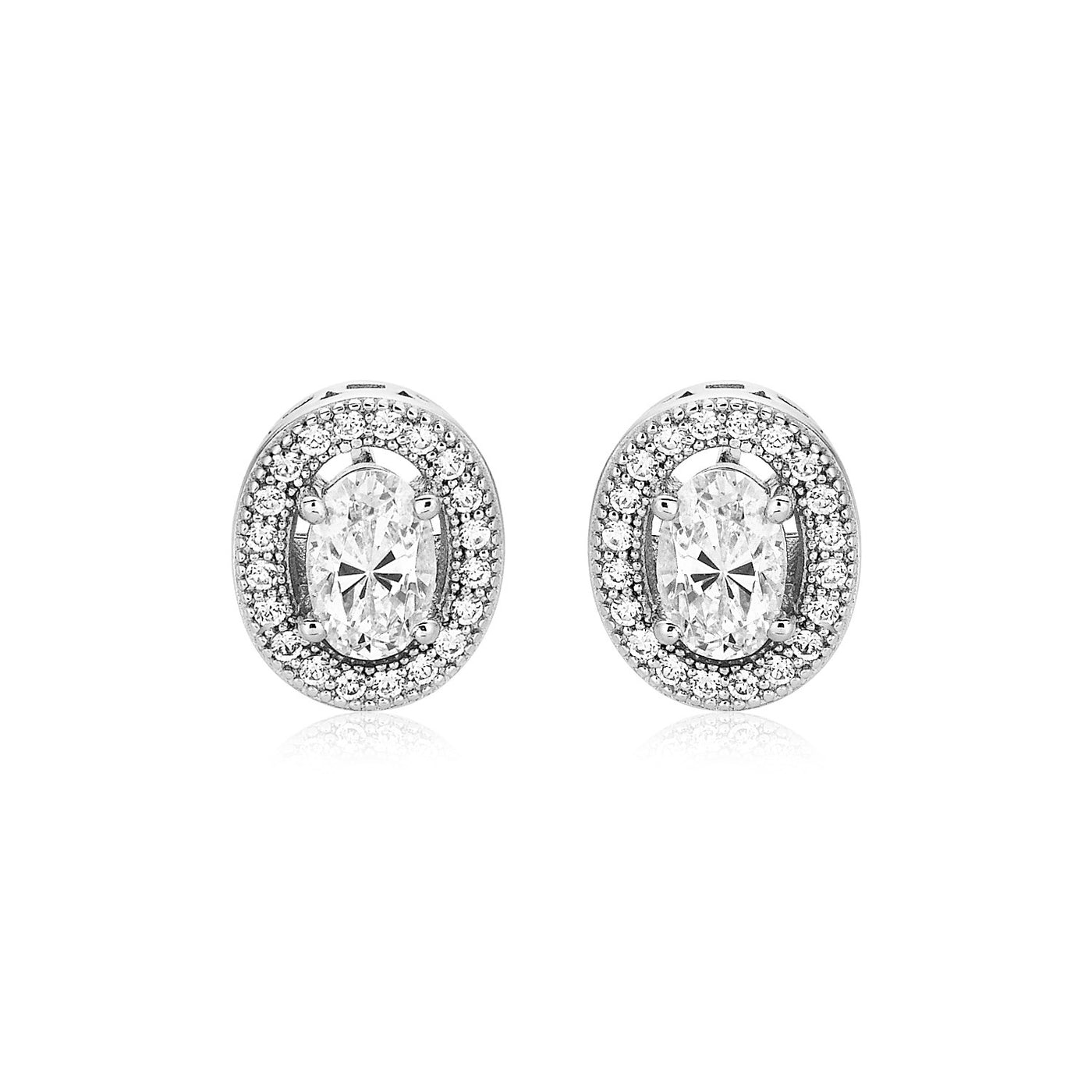 These unique earrings feature sparkling oval cubic zirconias surrounded by a unique pattern of beads in sterling silver. Post earrings...
