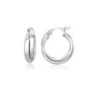 A showcasing a delightful twist on a classic design, these round hoop earrings feature two interlinked sections. Made of rhodium finished sterling silver and secured with snapbacks.