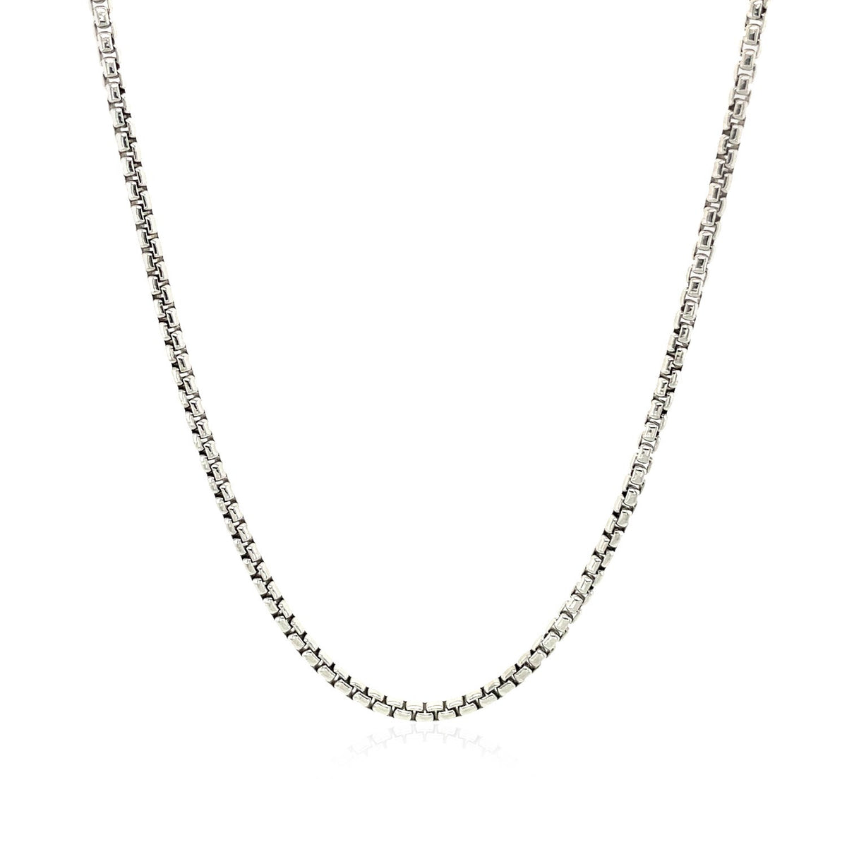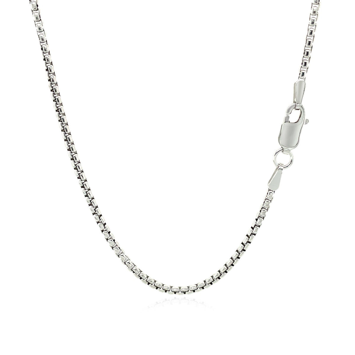 Cette chaîne à maillons ronds est en or blanc 14 carats et a une largeur de 1,8 millimètre.