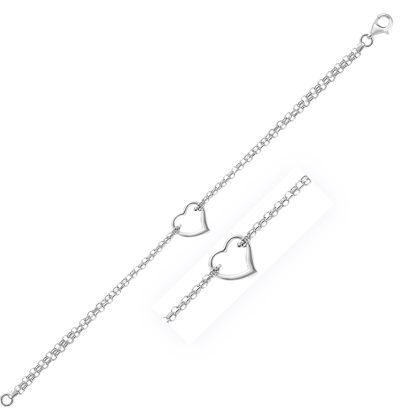 Een charmant enkelvoudig station met een open hart-stijl benadrukt de schattige look van dit enkelbandje met dubbele kabelketting. Gemaakt van 14-karaats witgoud, 25 cm lang en voorzien van een karabijnsluiting.