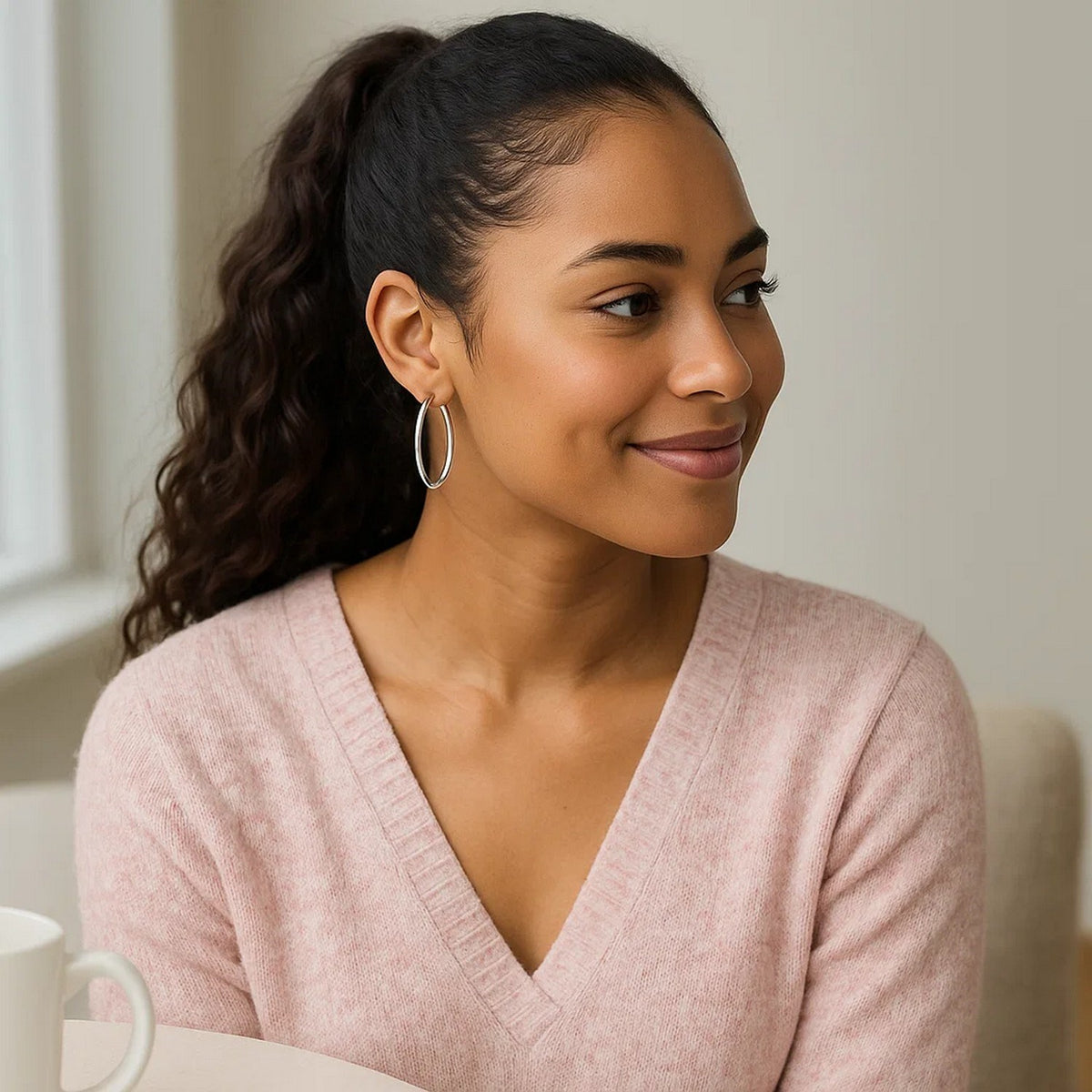 Deze oorringen zijn indrukwekkend in formaat, maar elegant dun in stijl. Ze hebben een gepolijste rhodiumlaag en zijn gemaakt van sterlingzilver. Ze zijn voorzien van een kliksluiting.