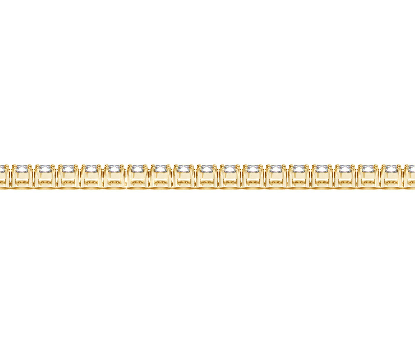 Classic four prong 5 carat total weight diamond tennis bracelet showcasing perfectly matched brilliant round cut lab grown diamonds set in 14k yellow gold.