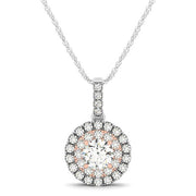 This round shape diamond double halo pendant features a 1/4 carat center diamond surrounded by smaller diamonds. Delightful with a diamond bar style bail, this pendant is made in 14k white and rose gold.