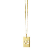 A reflective rectangular tag pendant with a cut-out Star of David is the focal point of this 14k yellow gold...