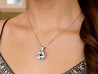 Positively charming, this pendant showcases a love knot style with intricate groove texture finish. Designed in sterling silver with rhodium plating.