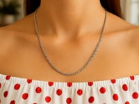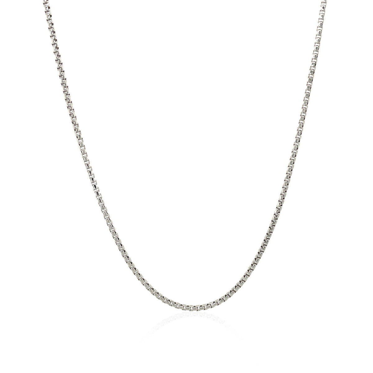 This rhodium-plated round box chain comes in sterling silver and has a width of 1.3 millimeters.