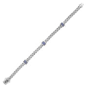 Delightfully chic, this woven style chain bracelet features tiny bar stations embellished with dazzling blue tone sapphires. A beautiful sterling silver piece is measuring 7 1/4 inches and secured with a button safety lock.