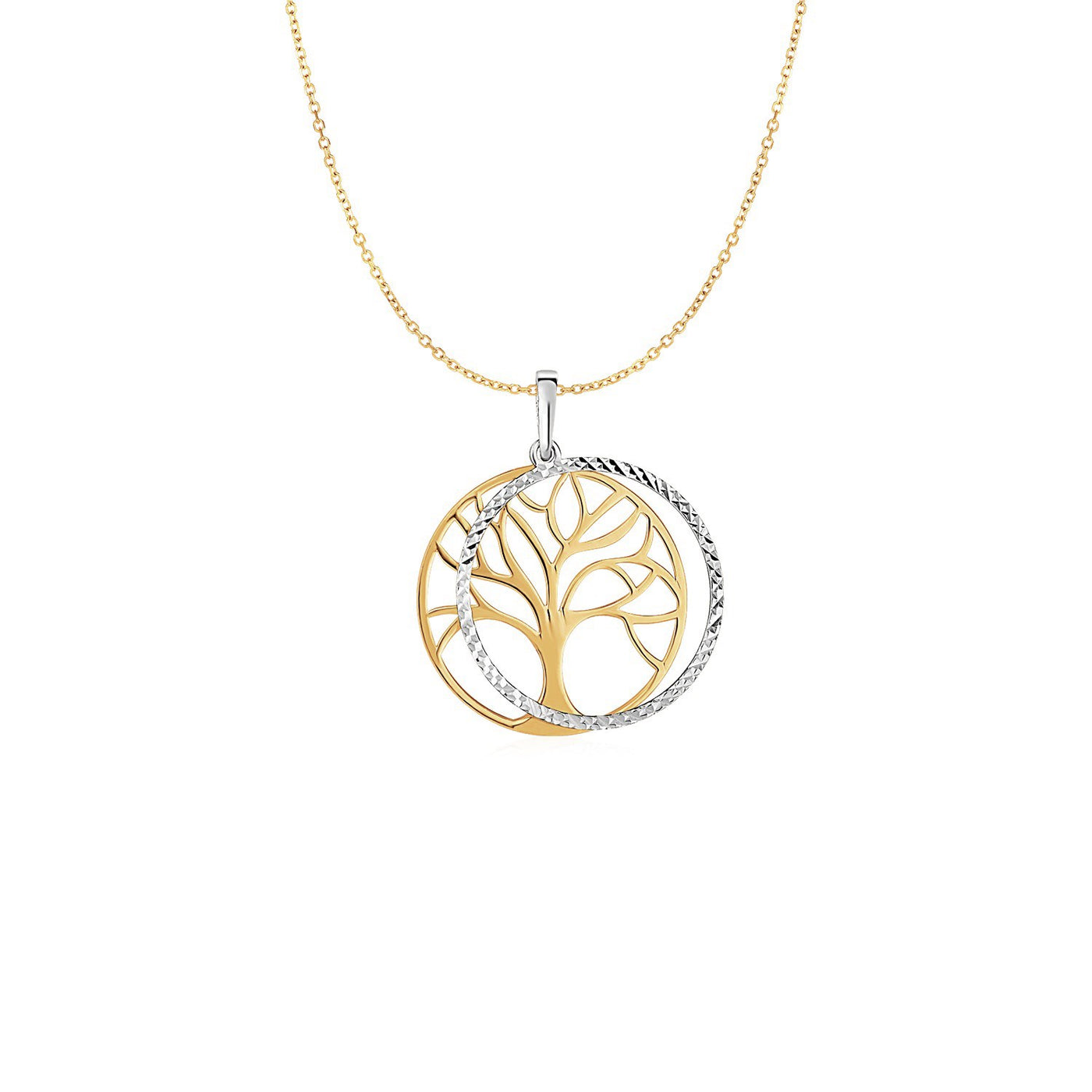 A round textured frame surrounds the classic tree of life on this beautiful gold pendant in yellow and white gold. Pendant closed with a lobster clasp.